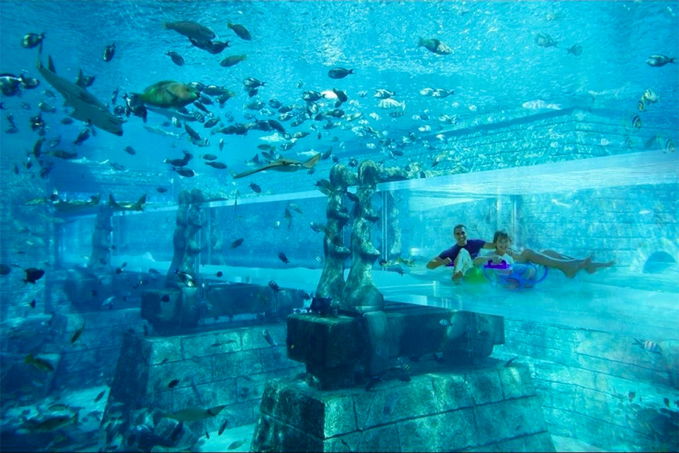 Le parc aquatique Atlantis à l’hôtel The Palm sis à Dubaï propose un cadre idyllique avec une succession de palmiers et un immense toboggan avec une partie sous-marine.