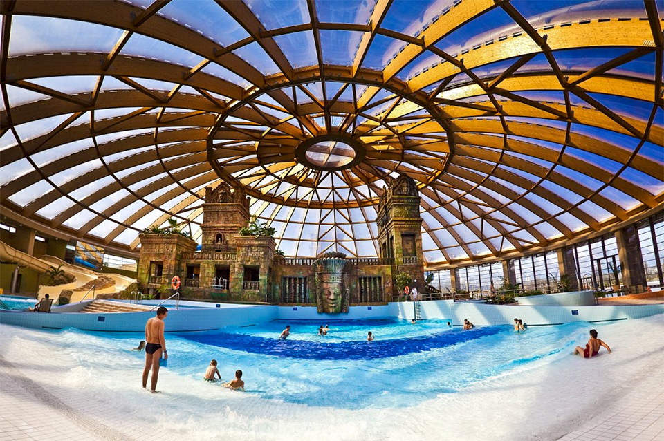 Le Ramada Resort Aquaworld en Hongrie, avec son bassin situé sous un dôme en verre aussi grand que majestueux.