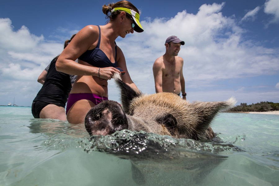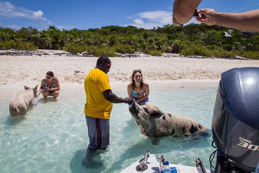 Tout se passe sur l’île déserte de Mayor Cay (aussi connue sous le doux nom de « Pig Island », ça ne s’invente pas). Le transport en bateau vers l’île ressemble à une mini-croisière tropicale, mais l’apothéose de ce voyage est véritablement l’arrivée de la troupe de cochons multicolores venant vous accueillir lorsque vous arrivez en vue de la plage. Cependant, n’oubliez pas de vous munir de restes de nourriture pour pouvoir les nourrir et les approcher de près !
