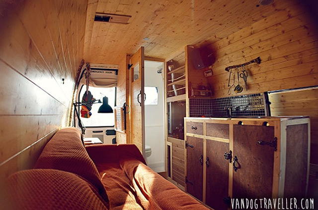 Les murs sont recouverts de bois, une matière privilégiée pour ce genre d’habitat, permettant d’ accentuer le côté chaleureux. Pour l’ameublement, on retrouve une table, un canapé confortable, des rangements, un petit bureau pliable et une toilette. Une touche déco originale est apportée par un tableau noir, permettant d’y inscrire des messages personnalisés. Le confort est de mise, grâce notamment à l’installation d’une petite cuisinette, l’essentiel pour le propriétaire. Un placard, un évier, une petite cuisinière et quelques rangements, tout est là pour équiper la cuisine.