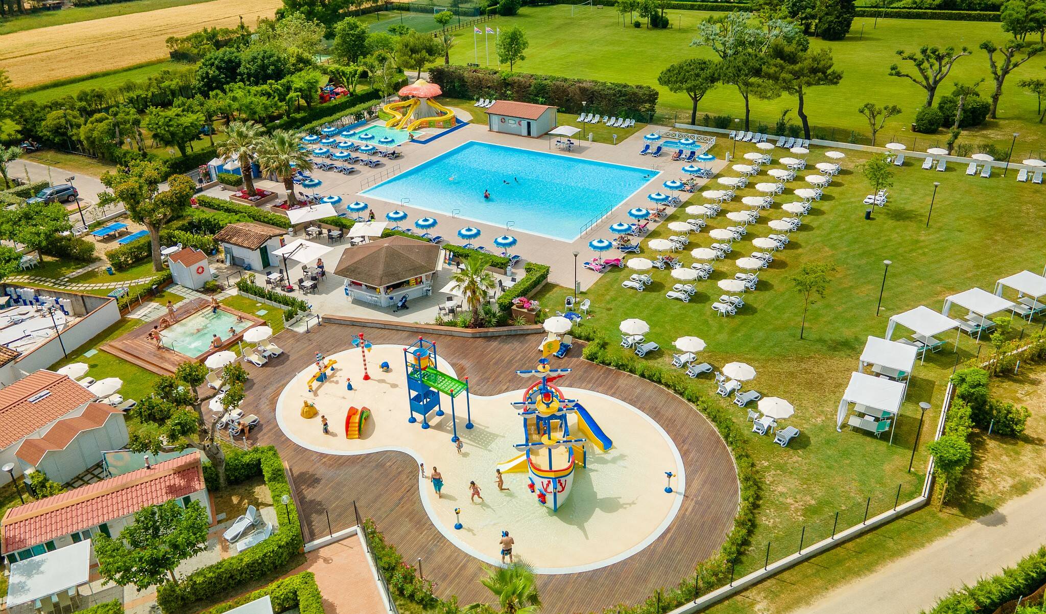 L'une des meilleures attractions du camping est son fantastique parc aquatique qui comprend plusieurs piscines ainsi qu'une aire de jeux avec un bateau pirate. Les enfants pourront s'amuser à dévaler les toboggans colorés et à patauger dans l'eaux peu profonde, tandis que les adultes pourront nager quelques longueurs, se détendre dans la piscine d'hydromassage ou profiter du soleil sur la grande terrasse.